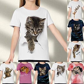 Para Meninas 3D Gráfico Animal Gato Camisa Camiseta Manga Curta Impressão 3D Ativo Estilo bonito Infantil 3-12 anos