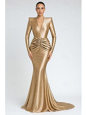 Sereia Tubinho Longo Vestidos de baile Vestidos de noite Vestido de Baile Vestido formal Elegante Estilo Celebridade Brilhante Manga Longa Decote V Festa de Jardim Casamento Paetês Crepe Esticado com