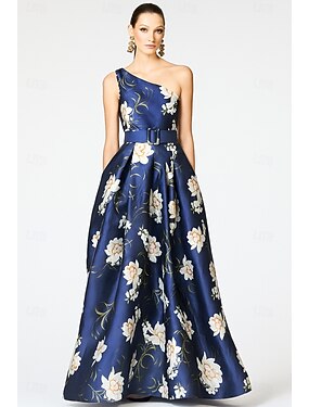 Linha A Longo Vestidos de noite Vestido de Baile Vestido formal Elegante Sem Manga Assimétrico Formal Convidado do casamento Bolsos Cetim com Estampa floral Fenda Bolsos