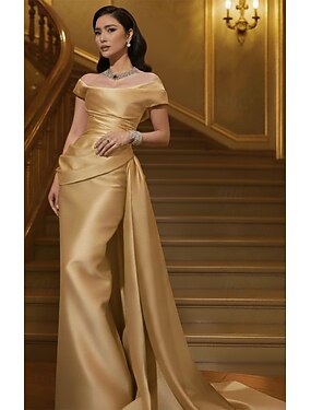 Sereia Longo Vestidos de noite Vestido de Baile Vestido formal Elegante Sedoso Sem Manga Ombro a Ombro Casamento Formal Cetim com Flor Shouder