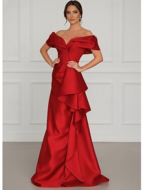 Sereia Longo Vestidos de noite Vestido de Baile Vestido formal Elegante Vintage Sem Manga Assimétrico Casamento Formal Capas Crepe Esticado com Purpurina Flor Shouder