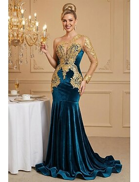 Sereia Cauda Escova Vestidos de baile Vestidos de noite Vestido de Baile Vestido formal Elegante Festa Manga Longa Assimétrico Baile de Formatura Formal Veludo com Detalhes em Pérolas Apliques