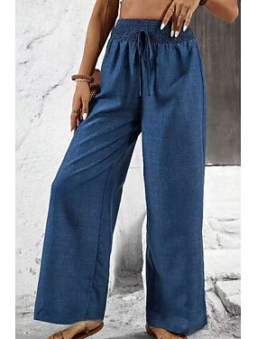 Mulheres Perna larga chinês Férias Moda Roupa de rua Comprimento total Cintura Alta Tecido Bolsos Cintura elástica Confortável Conforto Macio Com Stretch Ao ar livre Rua Azul Verão Primavera Outono