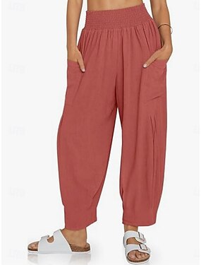 Mulheres Calças de linho de algodão Perna larga chinês Calça verão Férias Roupa de rua Básico Comprimento total Cintura Média Tecido Com Cordão Bolsos Conforto Sem Elasticidade Diário Ao ar livre Rua
