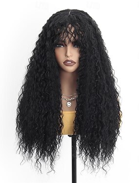 Perucas cacheadas para mulheres negras, peruca afro longa e cacheada preta natural com franja, perucas sintéticas de cabelo crespo cacheado para cosplay e uso diário.