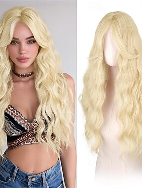 Peruca loira com franja cortina para mulheres - peruca longa ondulada com risca ao meio, de aparência natural, feita de cabelo sintético, ideal para uso diário, festas e cosplay, 66 cm (26 polegadas).