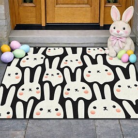 Tapete de Páscoa com um coelhinho divertido em preto e branco com bochechas rosadas, perfeito para dar as boas-vindas na Páscoa.