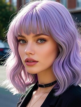 Peruca roxa com franja, peruca curta e ondulada para mulheres, peruca sintética na altura dos ombros, perucas cacheadas femininas para fantasias de Halloween, cosplay diário