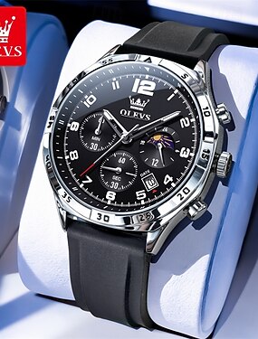 Relógio cronógrafo esportivo masculino Olevs, com pulseira de silicone preta, movimento de quartzo, data e fase da lua, resistente à água até 30 metros, mostrador grande e luminoso, relógio de luxo