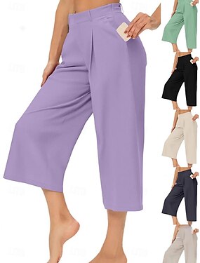Mulheres Perna larga Calças Cropped Roupa de rua Casual Mimolet Cintura Alta Côr Sólida Bolsos Respirabilidade Macio Micro-Elástica Férias Rua Roupa Diária Azul Preto Branco Marron Primavera Outono