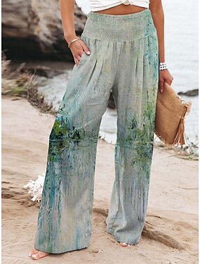 Mulheres Perna larga Calças Férias Casual Longas Cintura Alta Floral Cintura elástica Estampado Corte alto Respirabilidade Macio Micro-Elástica Férias Rua Roupa Diária Verde Escuro Primavera Outono