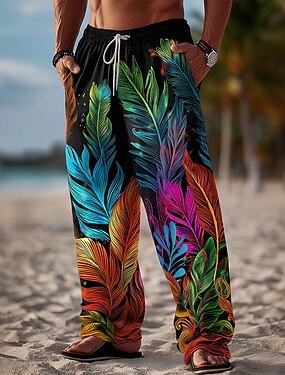 Homens Colorido Folha de palmeira Plantas Tropicais Calças Calças largas Calça casual Cintura Média Havaiana Ao ar livre Férias Roupa de Praia Cintura elástica com cordão Calças de linho com bolsos
