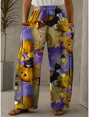 Mulheres Perna larga chinês Calças Férias Vintage Casual Comprimento total Cintura AltaPantsHalloween Gato Abóbora Bolsos Cintura elástica Estampado Confortável Macio Com Stretch Férias Rua Feriado
