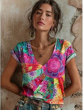 Mulheres Camiseta Tops de verão Camisetas Gráfico Plantas à moda Clássico Manga Curta Decote V Tops longos Diário Traje de festa para noite Esportes Azul Cinza azul vermelho-púrpura Preto Branco
