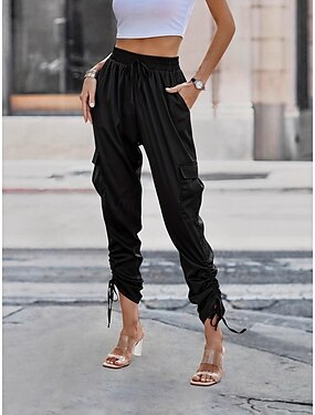 Mulheres Calças Cargo Perna larga Calças justas macacão Moda Roupa de rua Casual Comprimento total Cintura Alta Tecido Franjas Bolsos Confortável Sem Elasticidade Ao ar livre Férias Rua Preto