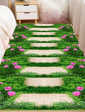 Tapete de área com estampa plana 2D, antiderrapante e de secagem rápida, com padrão visual 3D de flores e plantas. Macio, ideal para quarto ou ao lado da cama. Durável e fácil de cuidar.