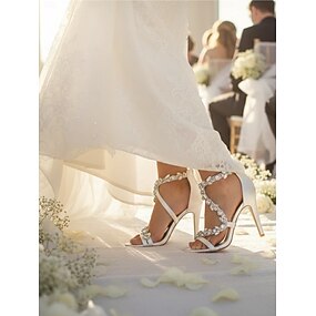 Sandálias de noiva brancas com aplicações de cristais – elegantes sandálias de salto alto com tiras para casamentos românticos.