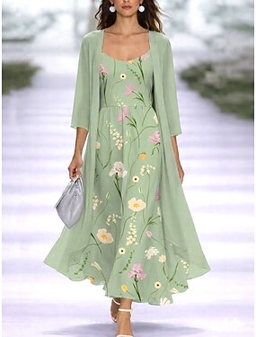 Mulheres conjunto de vestido Vestido A Line Elegante Férias Floral Gráfico Multi Camadas Imprimir Vestido midi Meia Manga Gola Redonda Diário Férias Azul Rosa Verde Verão Primavera Normal