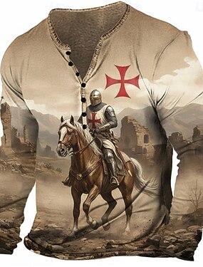 Homens Gráfico Cavaleiros Templários Camiseta Camisa Henley Camisetas Manga Longa Vintage Designer à moda Casual Diário Ao ar livre Primavera Verão Primavera Azul Marron Vermelho Henley Camiseta