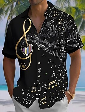 Homens Notas musicais Forma de Coração Camisa Social camisa de verão camisa de botão Manga Curta Moda Casual Férias Festival de Música Verão Primavera Aberto para a Lateral Impressão 3D camisas de