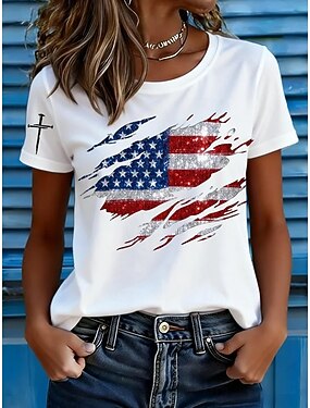 Dia da Independência Americana Mulheres Camiseta Imprimir Gráfico Bandeira americana Vintage à moda Clássico Manga Curta Gola Redonda Decote Redondo Tops regulares Casual Diário Azul Preto Branco