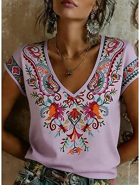 Mulheres Camiseta Bordado Imprimir Gráfico Plantas Tribal à moda Clássico Casual Manga Curta Decote V Tops longos Casual Diário Roxo Claro Verão Primavera