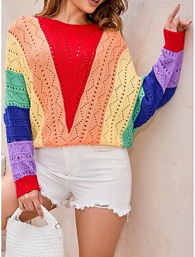 Mulheres Suéter Pulôver Moda Roupa de rua Casual Arco-Íris Estriado Gola Redonda Vazado Tricotado Manga Longa Tops regulares Tricotar Diário Ao ar livre Final de semana Arco-íris Verão Primavera