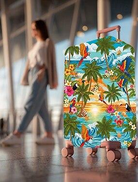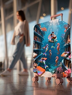Capa protetora elástica para mala de viagem com estampa inspirada no oceano.
