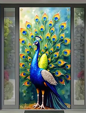 Faixa de porta vibrante em estilo pintura a óleo com pavão azul, colorida, com penas de pavão se abrindo, capa de porta decorativa 3D com animal artístico para entrada de jardim ou sala de estar.