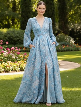 Linha A Longo Vestido formal Elegante Sem Manga Decote V Festa de Jardim Casamento Bolsos Organza com Pregas Fenda Estampado
