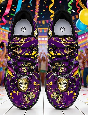 Womens Mardi Gras Tênis Athletic com Estampa de Confete e Cadarço - Calçados Festivos Confortáveis e Almofadados para Desfiles de Carnaval Celebrações de Rua Recados Diários e Atividades ao Ar Livre