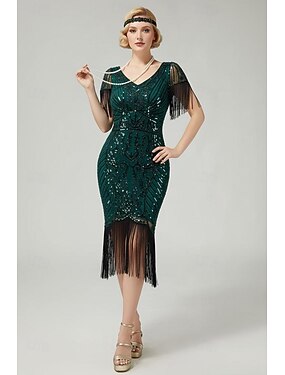 Loucos anos 20 Anos 20 Até os Joelhos Vestido melindroso Mangas curtas O Grande Gatsby Paetês Franja Decote V Fantasia Mulheres Natal Carnaval bar clandestino Mascarilha Festa Temática Retro Adulto
