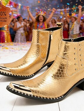 Botas masculinas ankle com estampa de crocodilo dourado de Mardi Gras – Luxuosas botas de couro bovino premium 100% design elegante para carnaval festas e eventos noturnos