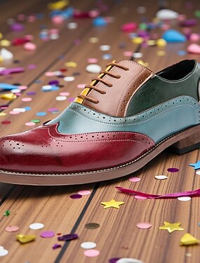 Oxford Masculinos para Mardi Gras em Couro Multi-Cores Vermelho Verde Azul e Marrom Design Estiloso Brogue com Perfuracões Decorativas Perfeitos para o Carnaval e Ocasiões Festivas