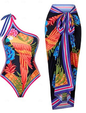 Mulheres Roupa de Banho Uma pedaço 2 partes Monoquíni Saia roupa de banho Compressão abdominal Cintura Alta Delgado Frente Única Férias Tropical Floral Gráfico Pescoço Assimétrico Sem Manga Fatos de