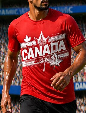 Camiseta masculina de futebol inspirada no Canadá, com estampa geométrica, ideal para atividades físicas, manga curta, proteção solar UPF 50, secagem rápida, tecido respirável e que absorve a umidade.