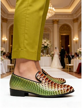 Mocassins masculinos de couro verde e marrom com estampa de cobra, modelo slip-on, ideais para baladas, festas, eventos ousados e casamentos.