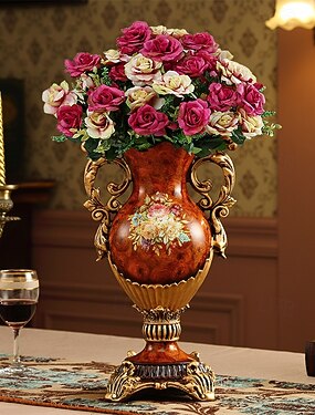 Conjunto de arranjos florais artificiais vintage europeus em vaso de resina com textura de madeira realista, design floral luxuoso, decoração elegante para sala de estar, sala de jantar e escritório.