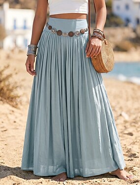 Mulheres Algodão Saia de férias Boêmia Casual Longo Cintura Alta Saias Sem Elasticidade Praia Férias ダークカーキ Cáqui Claro amarelo limão Verde mostarda Verão