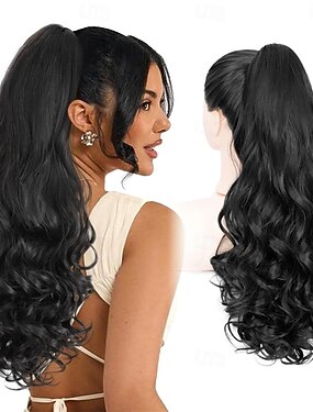 Extensão de rabo de cavalo com presilha, rabo de cavalo ondulado e cacheado preto de 50 cm (20 polegadas), aplique de cabelo sintético macio e com aparência natural para uso diário (50 cm, preto)