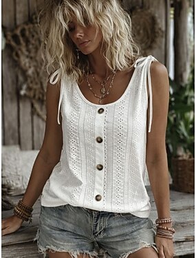 Mulheres Malha Íntima Ilhó Botões Tecido Moda à moda Clássico Sem Manga Decote U Tops regulares Diário Final de semana Azul Preto Branco Rosa Vinho Verão Primavera