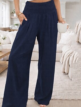 Mulheres Calças de linho de algodão Perna larga chinês Férias Roupa de rua Básico Comprimento total Cintura Média Tecido Bolsos Cintura elástica Conforto Confortável Sem Elasticidade Diário Ao ar