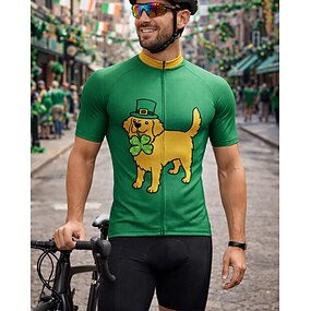 São Patrício Masculino Camisa para Ciclismo Cachorro Trevo Manga Curta Moto Camiseta Blusas com 3 bolsos traseiros Resistente a UV Secagem Rápida Com bolsos Zíper Frontal Esportes Verde Roupa