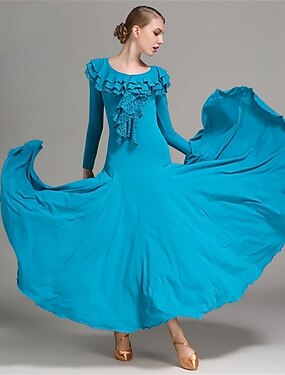 elegante vestido azul para dança de salão com decote franzido e mangas compridas para dança latina e social