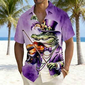 Carnaval Homens Crocodilo Contas Mardi Gras Flor de Lis Camisa Social camisa de verão camisa de botão Manga Curta Vintage retrô Feriado Verão Aberto para a Lateral Impressão 3D Camisa tipo linho Azul