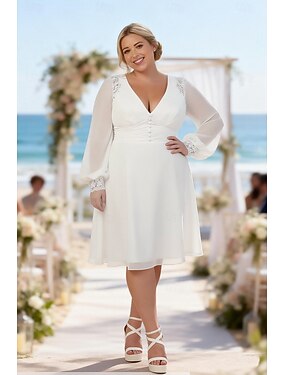 Linha A Longuette Vestidos de noiva Vestidos para Chá de Panela Vestido de Noiva Vestidos Brancos Justos Manga Longa Decote V Graduação Aniversário Chiffon com Pregas Cor Única