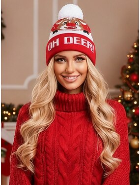 Gorro de Natal feminino em tricô – vermelho com estampa de rena e pompom, feito de poliéster, perfeito para as festas de fim de ano e para o inverno.
