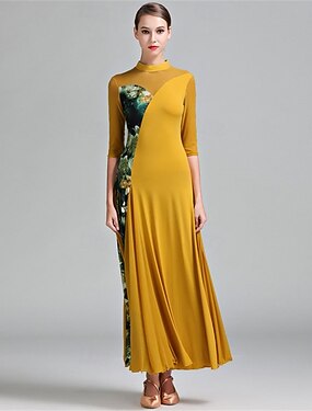 vestido de dança de salão chique com blocos de cores, detalhes florais e mangas compridas para apresentações e ensaios