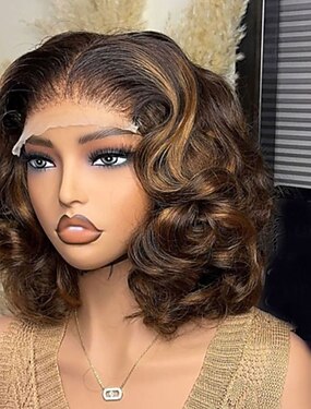 Cabelo Humano Fechamento 5x5 13x4 Lace Front Peruca Bob curto Com Franjas Cabelo Brasileiro Ondulado Marrom Multi Cores Peruca 130% 150% Densidade do Cabelo Cabelo com Luzes / Reflexos Sem cola
