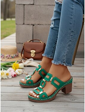 Sandálias casuais femininas verdes com salto bloco, palmilha acolchoada de suporte, design estável com salto médio para uso diário, caminhadas na cidade, viagens e eventos sociais.